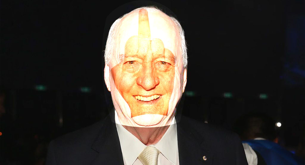 Street artist Bansky has started following Alan Jones around projecting his latest work onto the radio shockjock’s huge bald forehead.