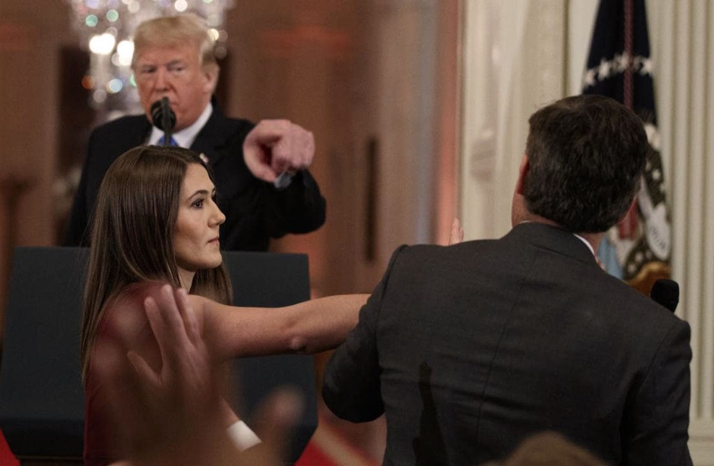 “We stand by the video, and these new images. The question is very simple: did his arm come into contact with hers? Did President Trump then dive in between them like he was taking a bullet? Did Jim Acosta then lose all control of his bowels and urine in fear?”